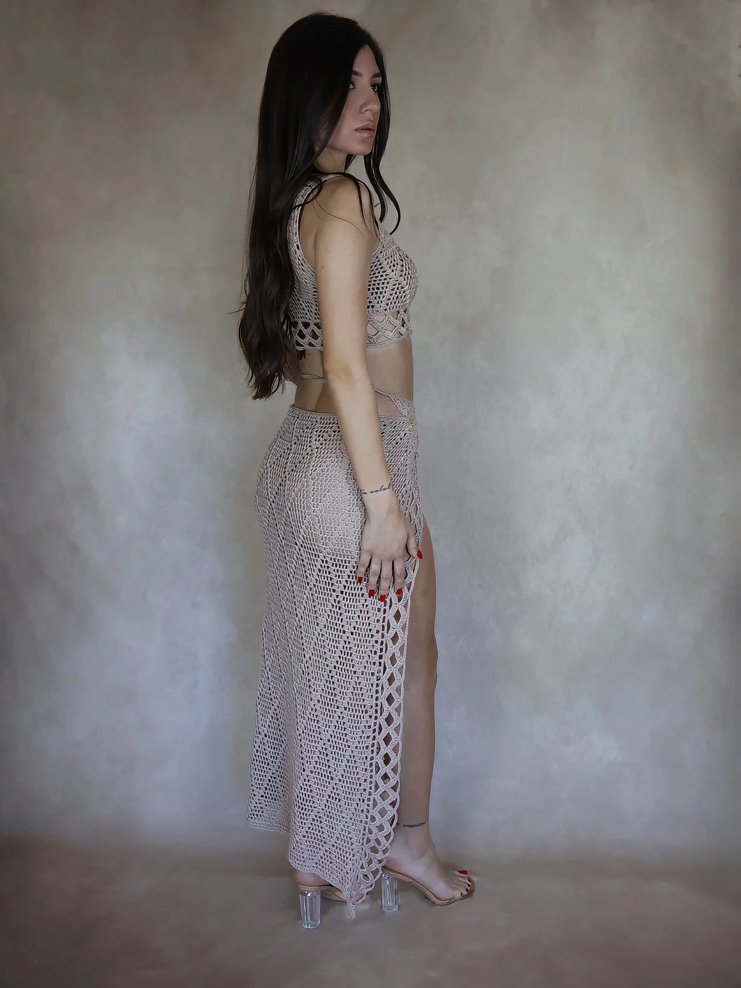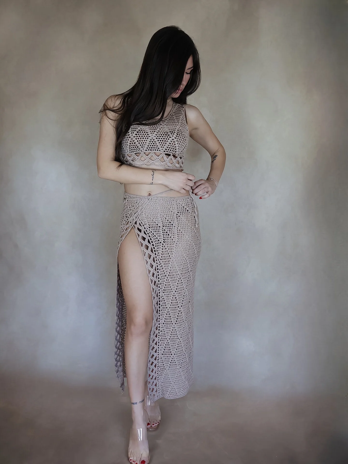 Effortlessly bold and undeniably feminine, the Sierra Set features a handcrafted crochet crop top paired with a matching high-waisted skirt - a perfect blend of texture, comfort, and sun-ready style.
